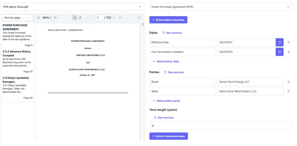 Since ClauseSense focuses on a specific chunk of text to find its data, it may overlook information like dates, parties, and term length. To address this, we add it back in prior to running the actual ClauseSense analysis. To confirm the information click “see sources” in the purple and hit the links on the left-hand side to see where the information is coming from. You can modify the extracted data as needed–this is a very important step! .