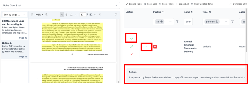 Hit expand table to see a bigger version of extracted data. Under type, click Periodic (sometimes Continuous appears as well), select it. Then choose Actionable Compliance items to pull up items that are affiliated with a date or dollar value. To get more specific, you can also filter by Annual or Monthly under the Frequency. This will bring up actionable items that occur on a monthly or annual basis. You can also sort by the Tags, say you want to search up anything related to Financial Statements, just type in Statements into the tags section and the tags that it identified with that subject will appear. Once you’ve identified the item you want to track, click the down arrow to see the action and the source (which will appear on the lefthand side at the bottom). Note, hallucinations can be identified by not being able to reference a source, so if there is no down arrow there is likely not a source and therefore the item is possibly a hallucination.