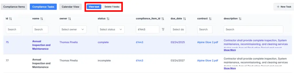 - Compliance Tasks: A sub-view to the compliance item, it is the specific date and subsequent dates that the Compliance item is due. Use the ID number from Compliance Items to find the set of compliance items (in this case 61443 from above). To edit a specific Task, click the task directly, a highlight will appear, and then click View Task, and then Edit. An ID number will also be assigned.