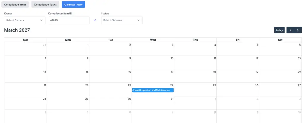 You can take the Compliance ID from the Compliance Item section and find it in the calendar by searching for it in Compliance Item ID. Navigate to the month it is due in. Status: Blue = Incomplete, Green = Complete, Red = Overdue.